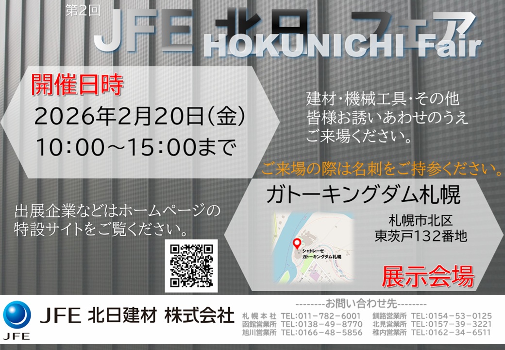 好評だった前回のフェアに続き、2026年2月20日に第2回JFE北日フェアを開催致します。皆様のご来場をお待ちしております。