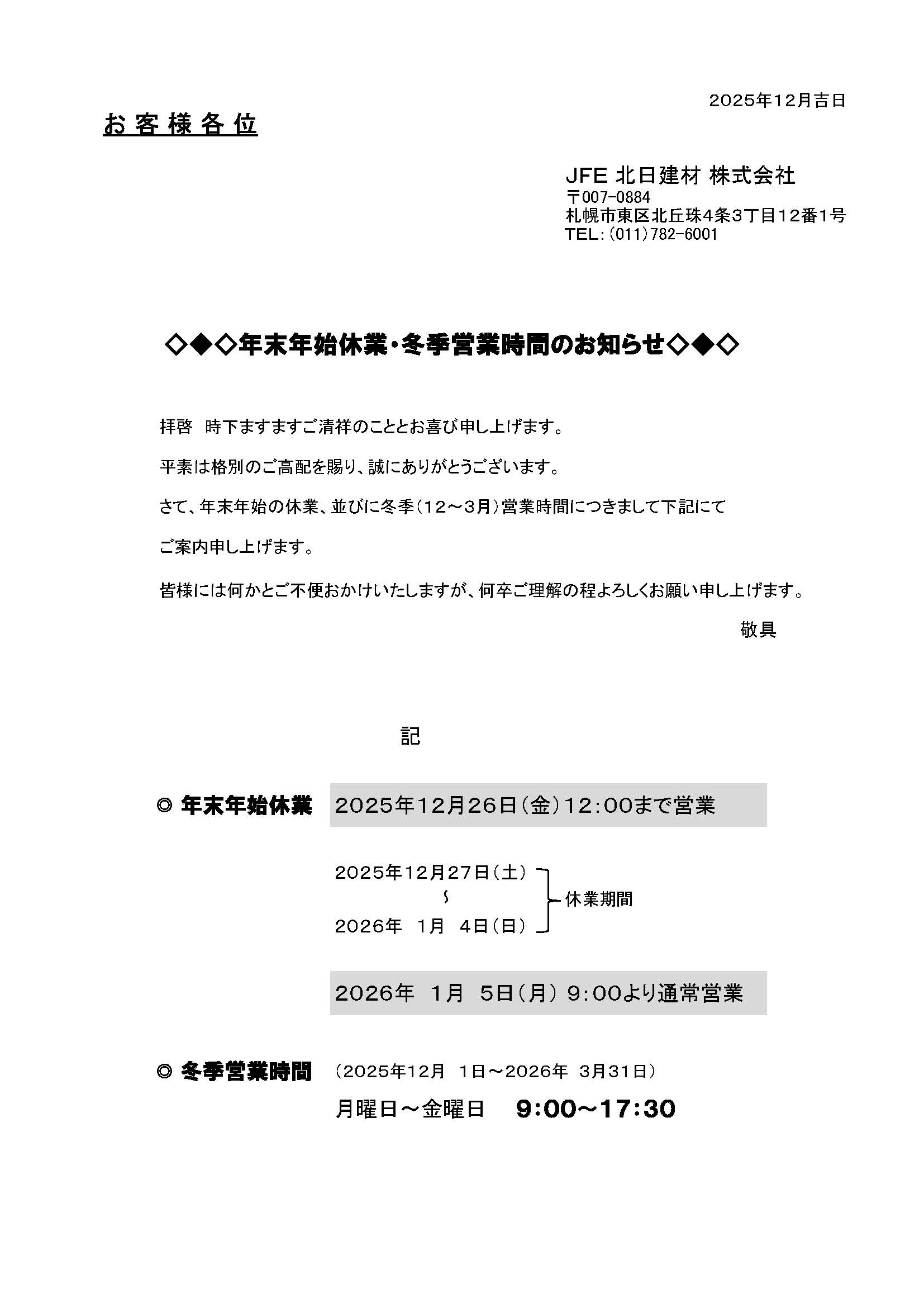年末年始休業・冬季営業時間のお知らせ