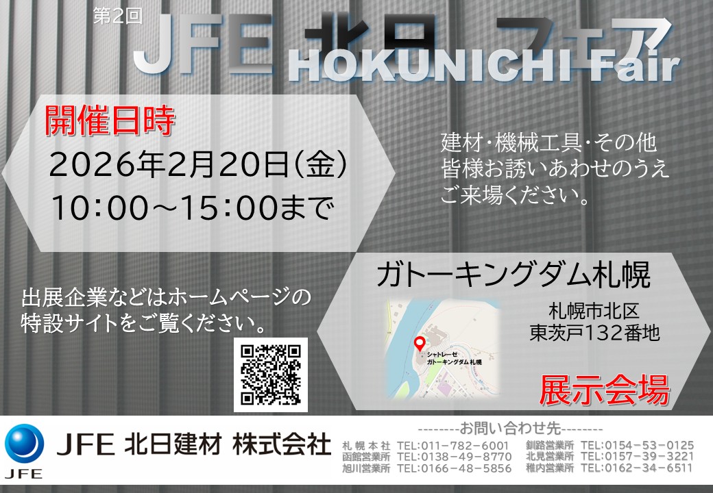 好評だった昨年のフェアに続き、2026年2月20日に第2回JFE北日フェアを開催致します。皆様のご来場をお待ちしております。