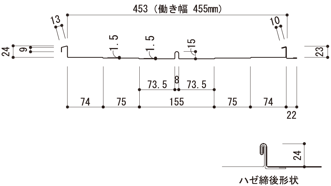 平成ルーフ | 0.35㎜~0.4㎜ | 229㎜~455㎜(可変) | カタログ 納まり図 |